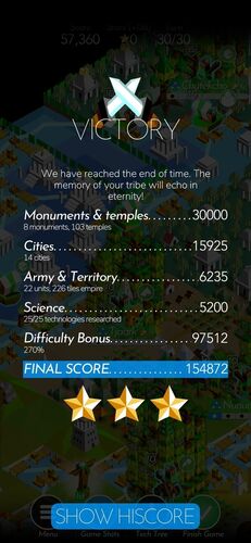 数百時間もPolytopiaで溶かしていると、脳死状態でプレイしても10万点は確実に行くようになる。リーダーボードでトップに載る程度のハイスコアは大体15万点前後(それ以上はおそらくスコア増殖バグを使っている)。 10万点を目指すことと15万点を目指すこと…